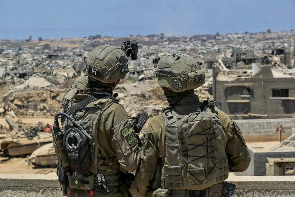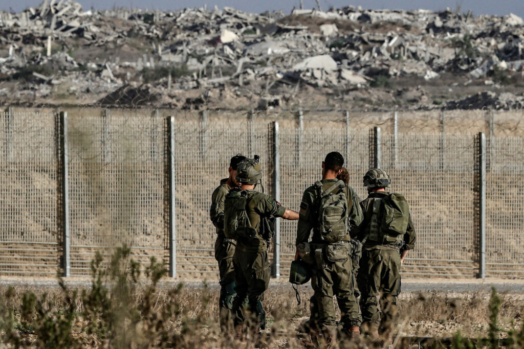 Des soldats israéliens se tiennent du côté israélien de la frontière avec la bande de Gaza, le 28 août 2025. (Tsafrir Abayov/Flash90)