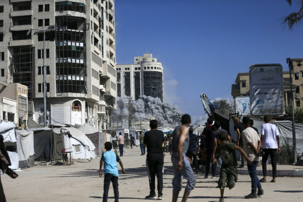 Au moment où une frappe aérienne israélienne touche une maison dans le camp de réfugiés d’Al-Shati, à l’ouest de la ville de Gaza, le 28 septembre 2025. (Fathi Ibrahim/Flash90)