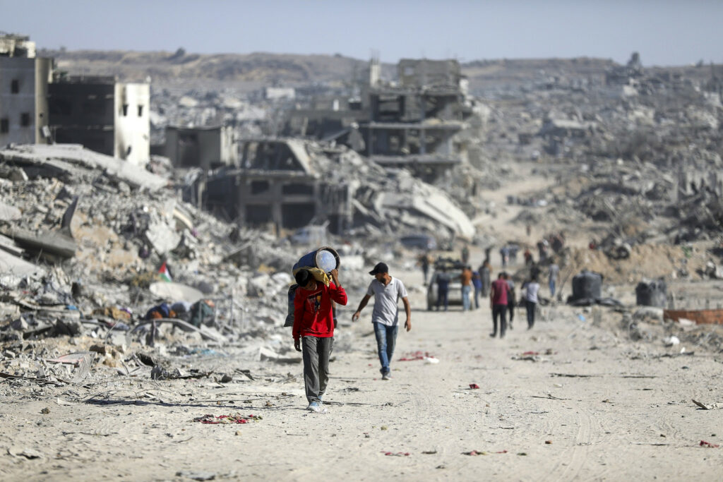 Des Palestiniens retournent sur les lieux de ce qui reste de leurs maisons, dans le quartier de Sheikh Radwan à Gaza, le 11 octobre 2025. (Yousef Zaanoun/Activestills)