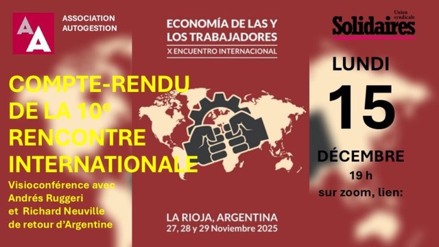 L’Association pour l’autogestion et l’Union syndicale Solidaires organisent un webinaire lundi 15 décembre à 19 heures avec la participation d’Andrés Ruggeri, Anthropologue, enseignant à  l’université de Buenos Aires et coordinateur du réseau international de l’économie des travailleur-se-s, et Richard Neuville, militant de L’Association autogestion.
