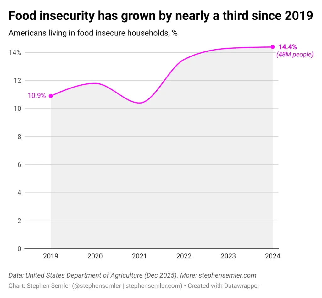 (Il devait être publié en octobre, mais il a été retardé en raison de la fermeture du gouvernement et, vraisemblablement, des 18 000 licenciements à l’USDA.) L’étude a révélé que 48 millions d’Américains vivent dans des foyers en situation d’insécurité alimentaire, soit 14,4 % de la population, ce qui représente une augmentation de 32,1 % par rapport à 2019. L’insécurité alimentaire n’a jamais été aussi élevée depuis plus de dix ans.