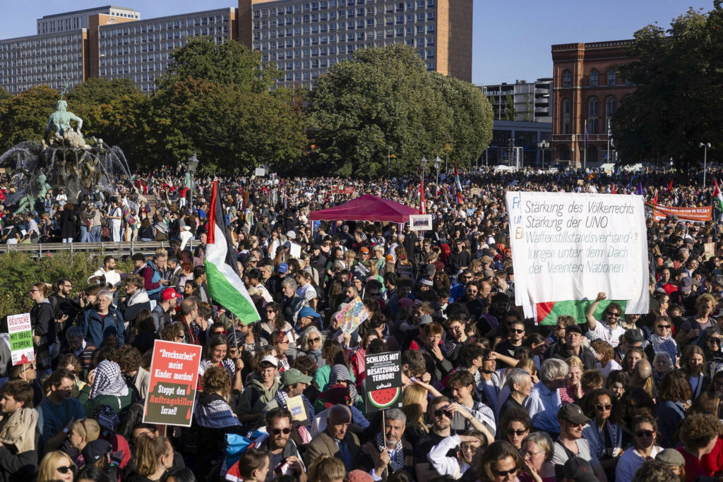 Plus de 100 000 manifestants réclament la fin du génocide à Gaza, sur l’Alexanderplatz, à Berlin, en Allemagne, le 27 septembre 2025. (Oren Ziv/Activestills)