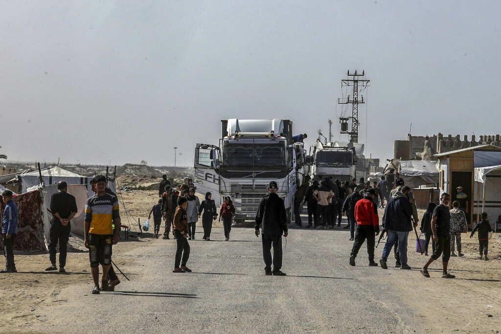 L’aide humanitaire entre à Gaza par le poste frontière de Rafah depuis l’Égypte, dans le sud de la bande de Gaza, le 1er février 2026. (Abed Rahim Khatib/Flash90)