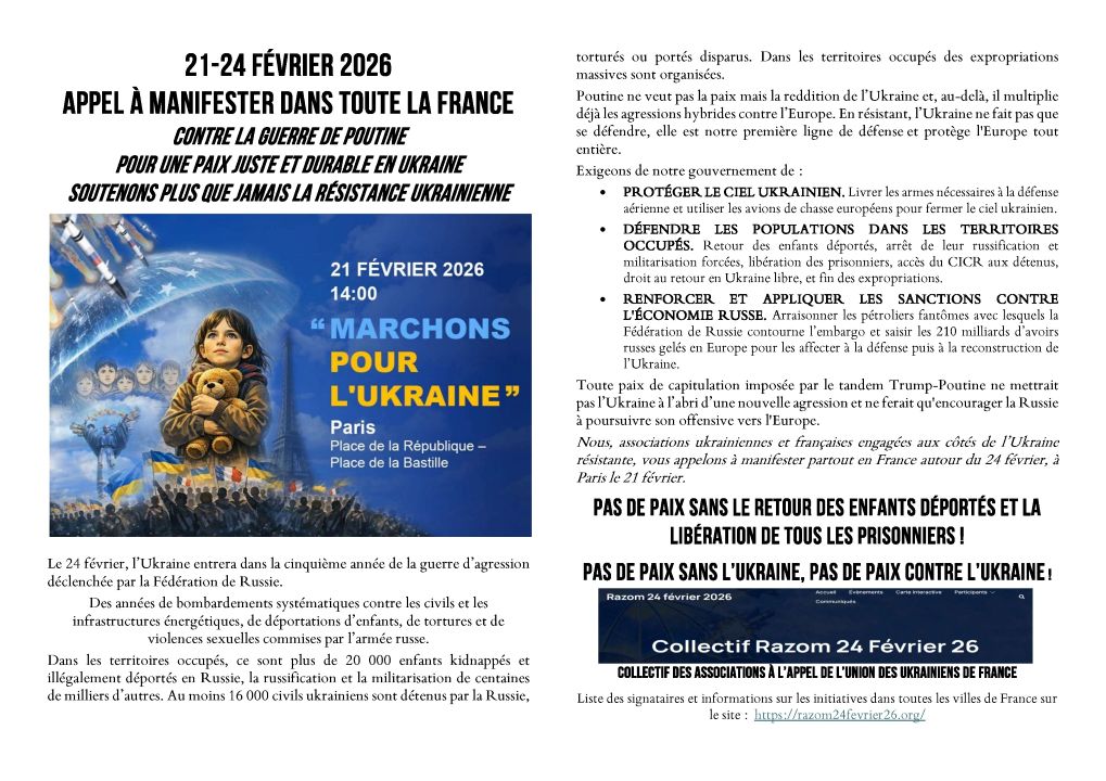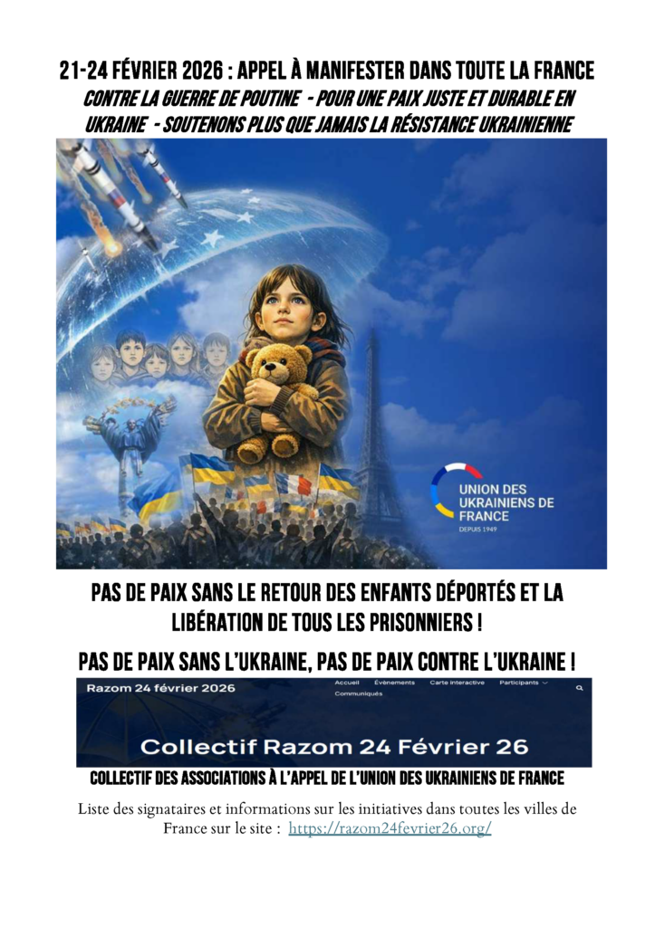 Aujourd’hui, 21 février 2026, le peuple ukrainien résistant, chaque jour bombardé, chaque jour renaissant, reste debout après quatre années d’une guerre menée par le régime dictatorial de Poutine. Celui-ci veut asservir les Ukrainiennes et les Ukrainiens debout pour liberté et opprime également les peuples de la Fédération de Russie.
