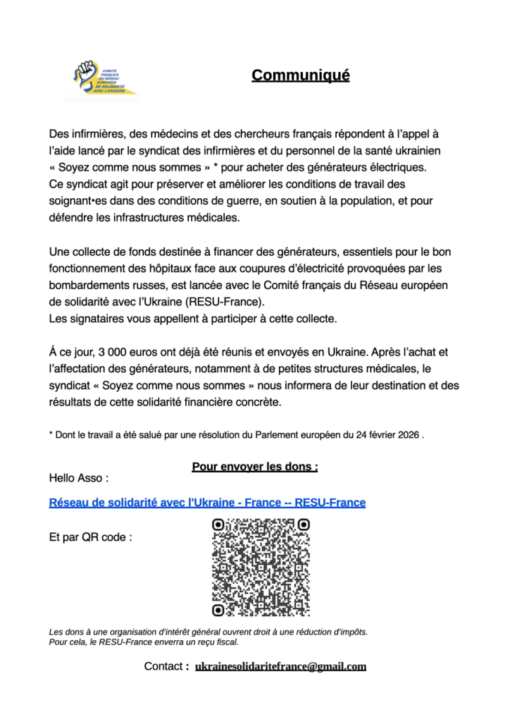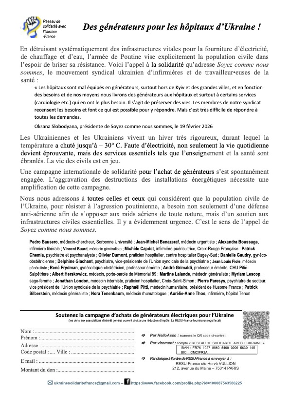 International, Le RESEAU, Politique et Social Appel de personnels de santé. Des générateurs pour les hôpitaux d’Ukraine. Publié le 25 mars 2026 SantéSolidaritéUKRAINE Suivant →
