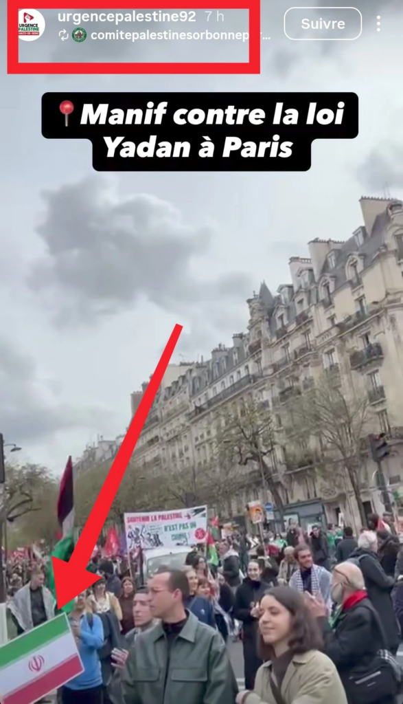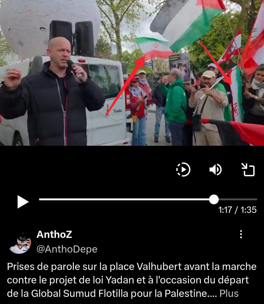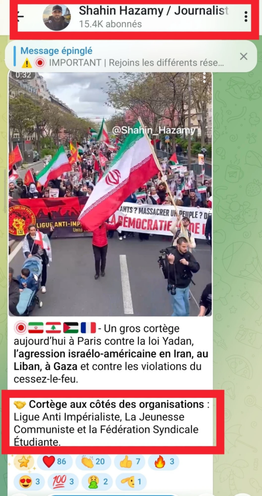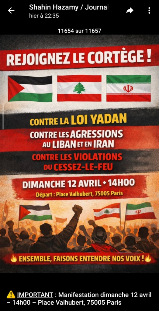 Le 12/04/2026, Shahin Hazamy a de nouveau organisé un cortège pro régime iranien au cours de la manif contre la Loi Yadan organisée par Urgence Palestine, l’UJFP,le PIR, Perspectives Musulmanes, le NPA & cie..