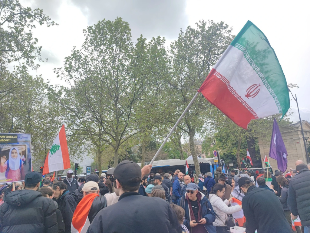 Notons qu’au-delà de ce cortège d’authentiques militant-e-s pro-régime iranien, on pouvait voir des drapeaux du régime iranien tout au long de la manif « officielle » notamment dans le cortège d’Urgence Palestine qui avait salué la RI.