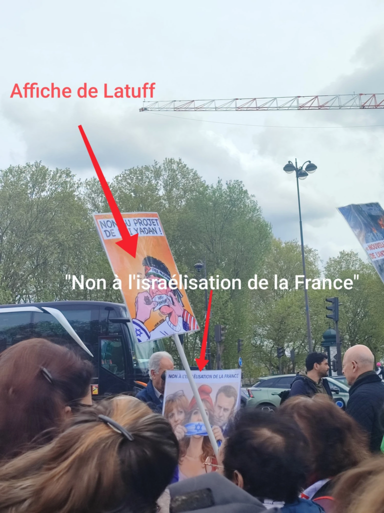 Comme à son habitude, Europalestine s’est illustrée avec une affiche antisémite « Non à l’israélisation de la France » et une affiche du dessinateur primé par le régime iranien lors d’un concours de dessins négationnistes, Latuff